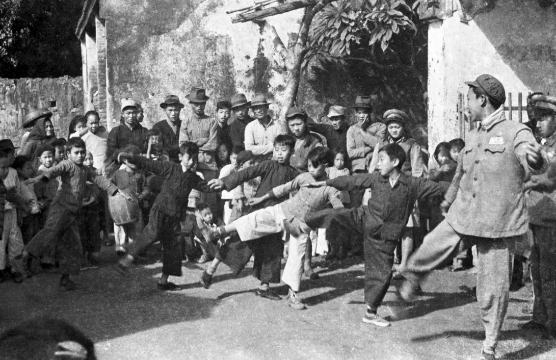 1950年初,粤桂边纵队战士在刚解放的村庄教孩子们跳舞。(摄影:黄谷柳)