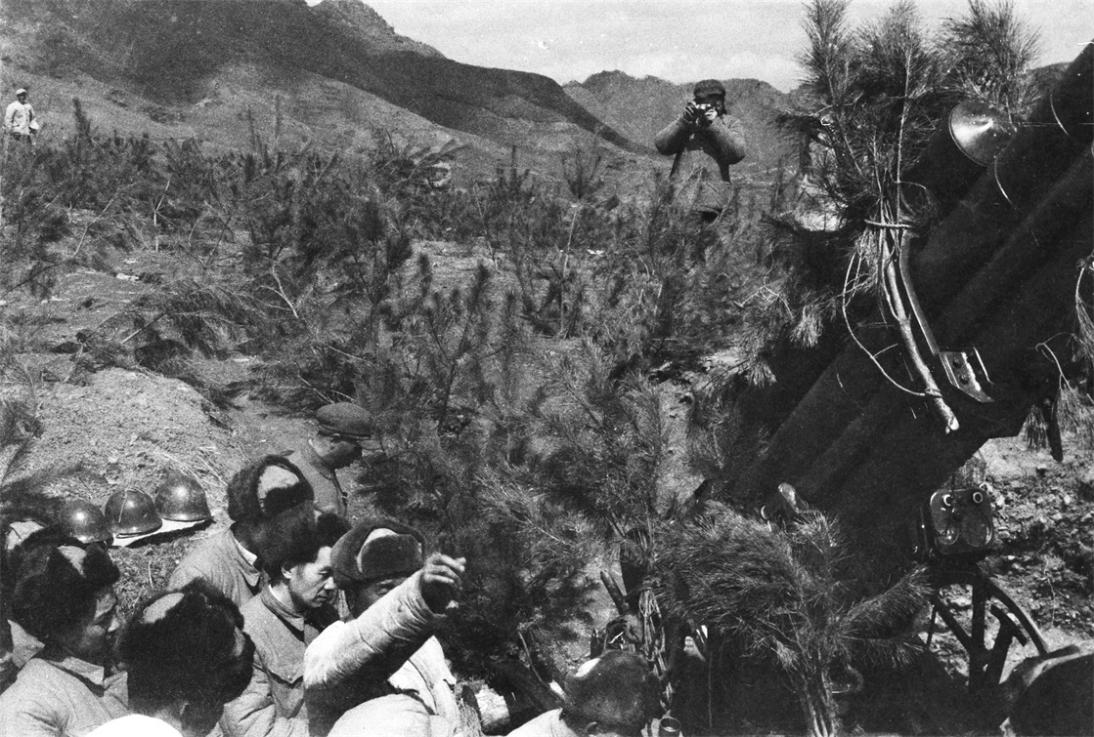 山上小松树密布,是炮兵们弄的伪装,这样的青山一连好几座,每门高射炮都用电力操控,一条电线从炮身通到指挥仪。指挥仪周围坐了八个小战士,他们时刻把敌机的航速、距离给各炮计算好,连长发一声号令,阵地上每一门炮都动了起来。(摄影:黄谷柳)