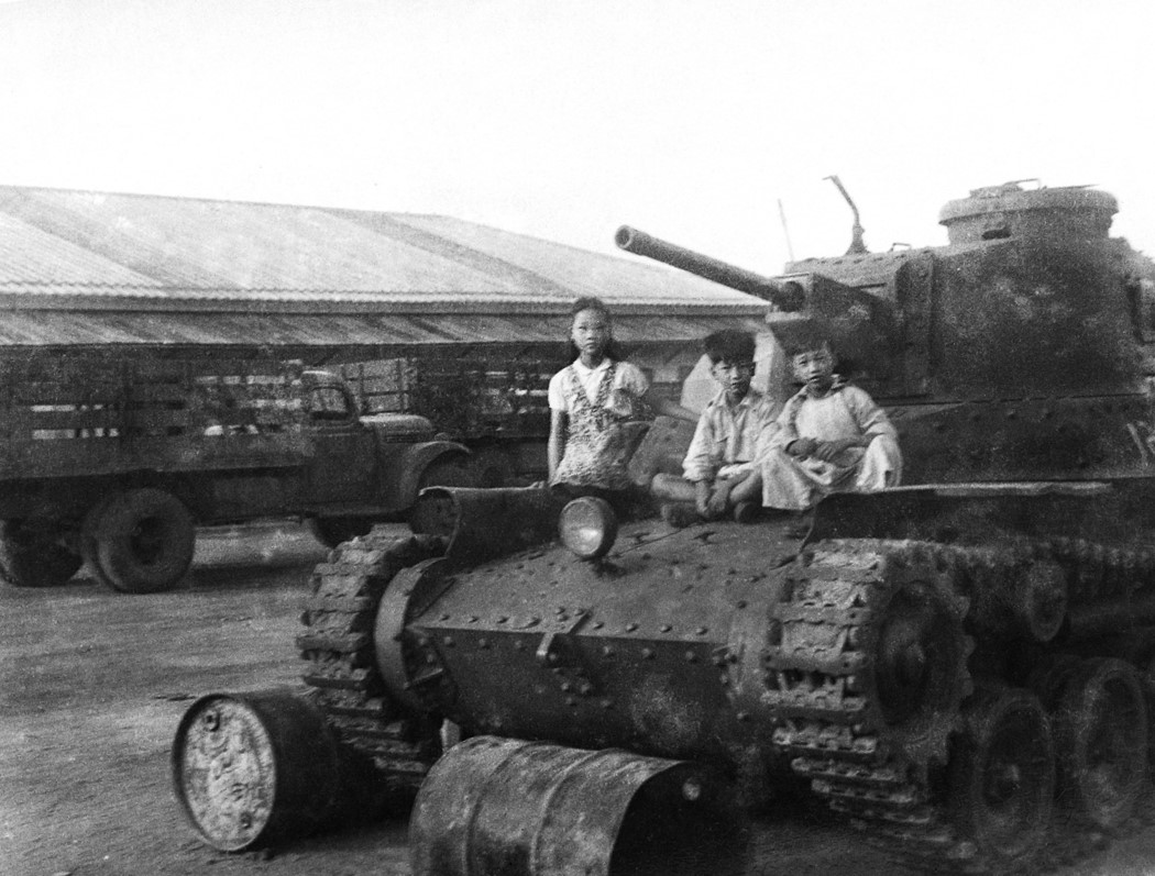 1950年5月,海南岛解放,儿童把敌人的坦克当玩具。(摄影:黄谷柳)